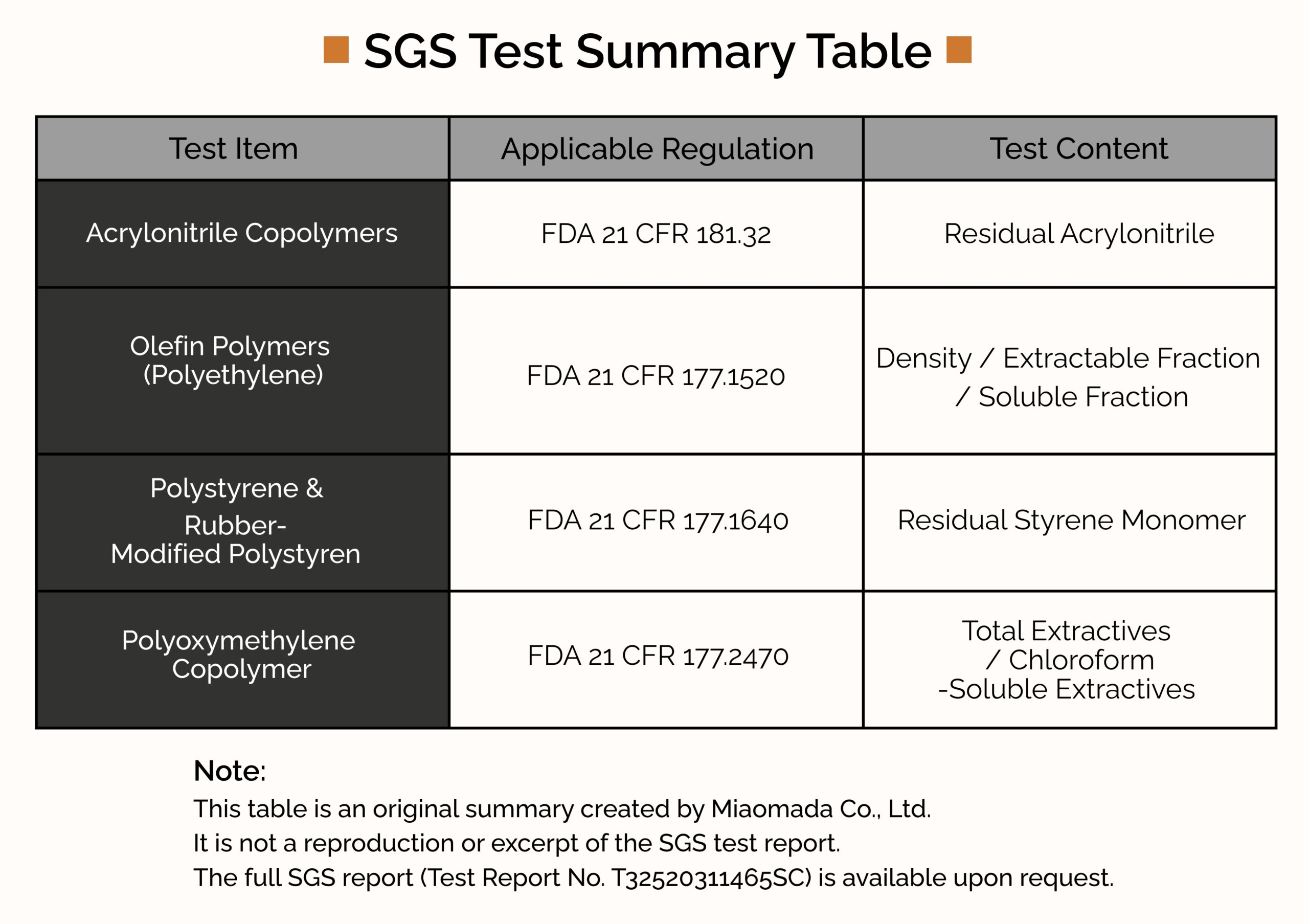 To ensure safety for daily use, all food-contact components were tested by SGS (July 2025). The materials passed U.S. FDA food-contact requirements (21 CFR 181.32, 177.1520, 177.1640, and 177.2470), confirming food-contact safety for everyday use. Testing was conducted by SGS Hong Kong.