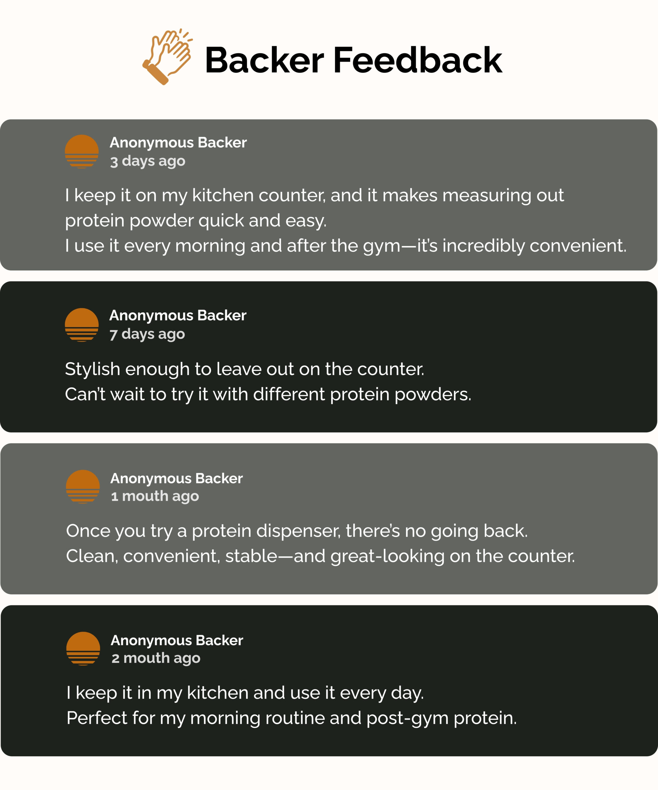 DP-M2 first launched in Japan, where it earned great reviews from users. Now we’re ready to bring it to the U.S.—one of the largest and most active fitness communities in the world. Protein dispensers are still an emerging category, and many people don’t even know they exist. That’s exactly why we chose Kickstarter. It’s where people discover new ideas early and support products they believe in, so it felt like the most natural place to introduce DP-M2 to the U.S. If it can save you time and remove a little friction from your daily routine, then we’ve accomplished our goal.ved our goal.