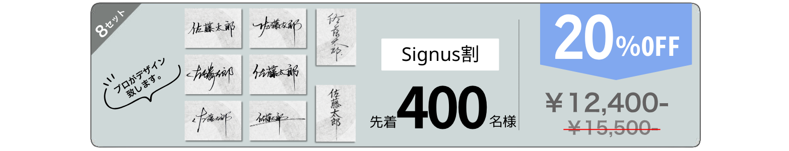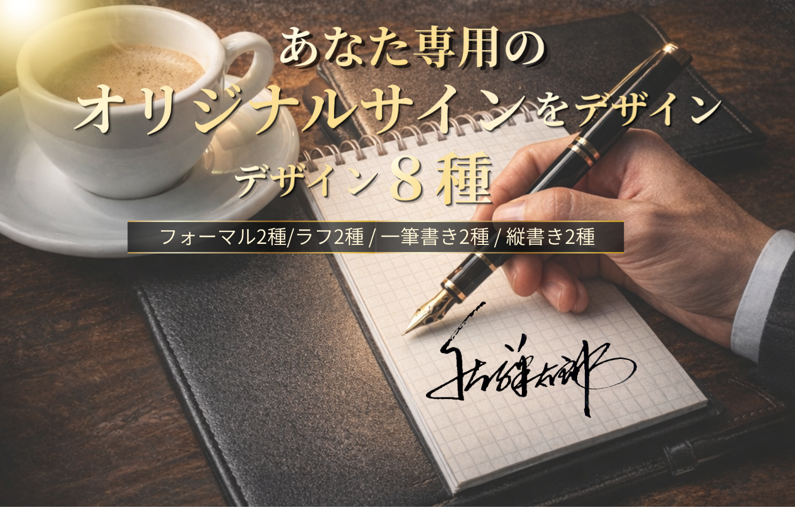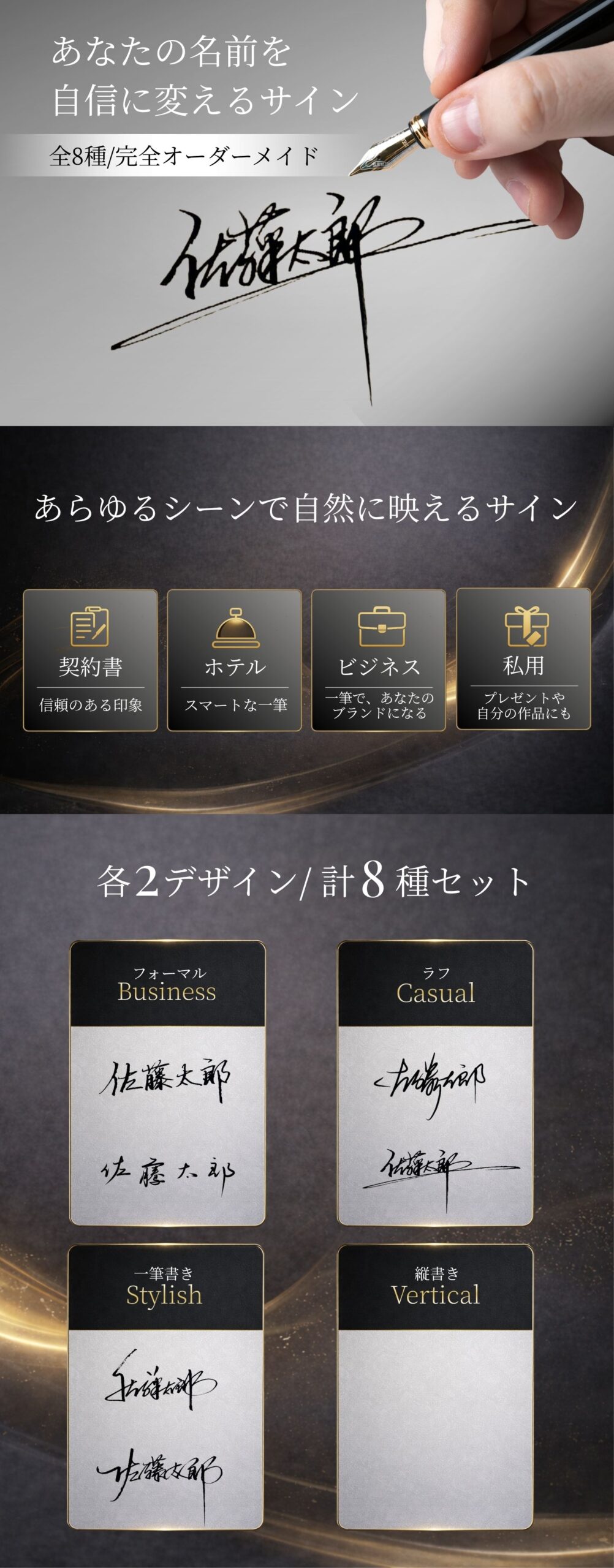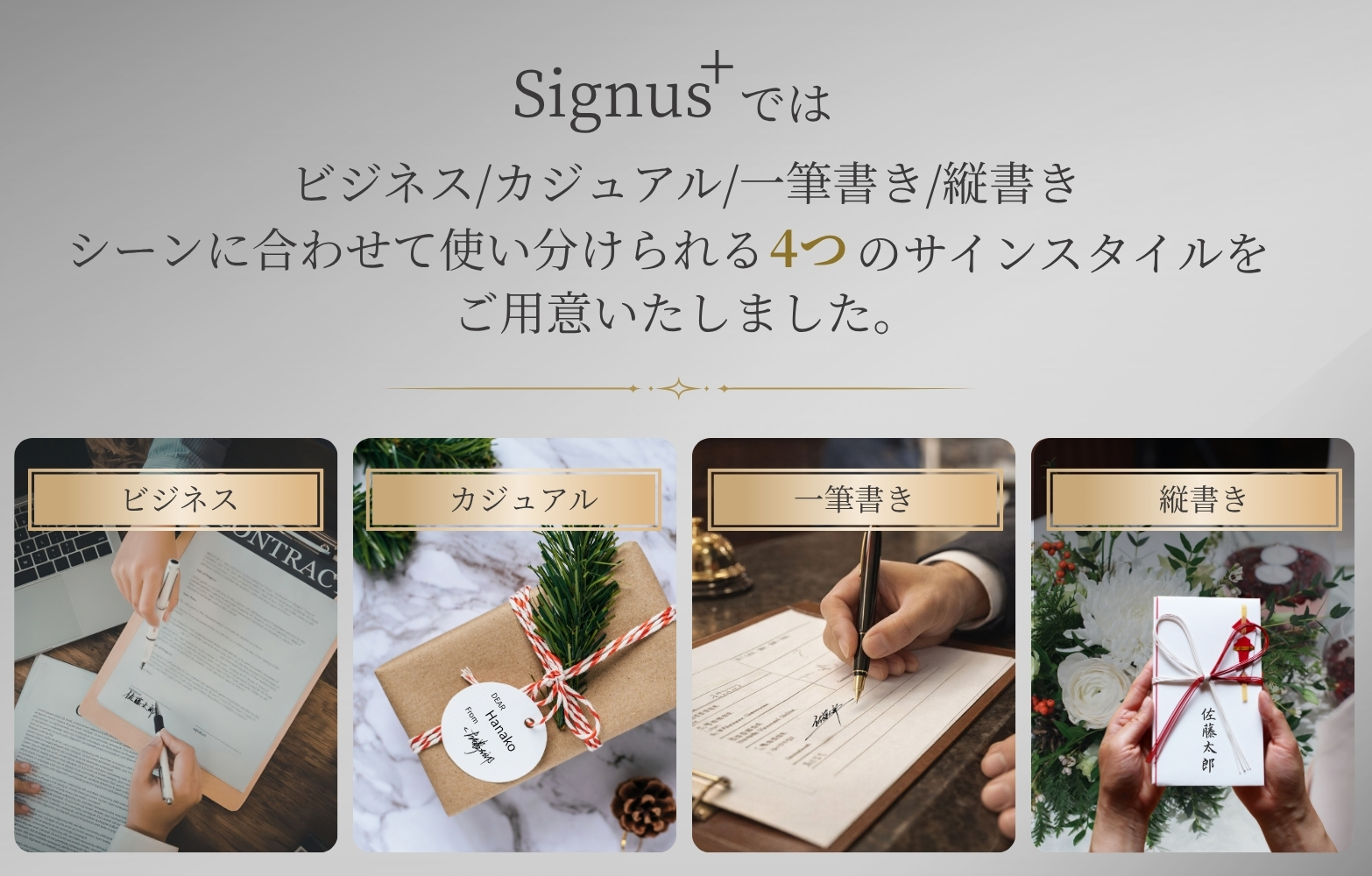Signus+(サイナスプラス)では、デザイナーによる完全オーダーメイドのサインを8種類(ビジネス2種類/カジュアル2種類/一筆書き2種類/縦書き2種類)ご用意。