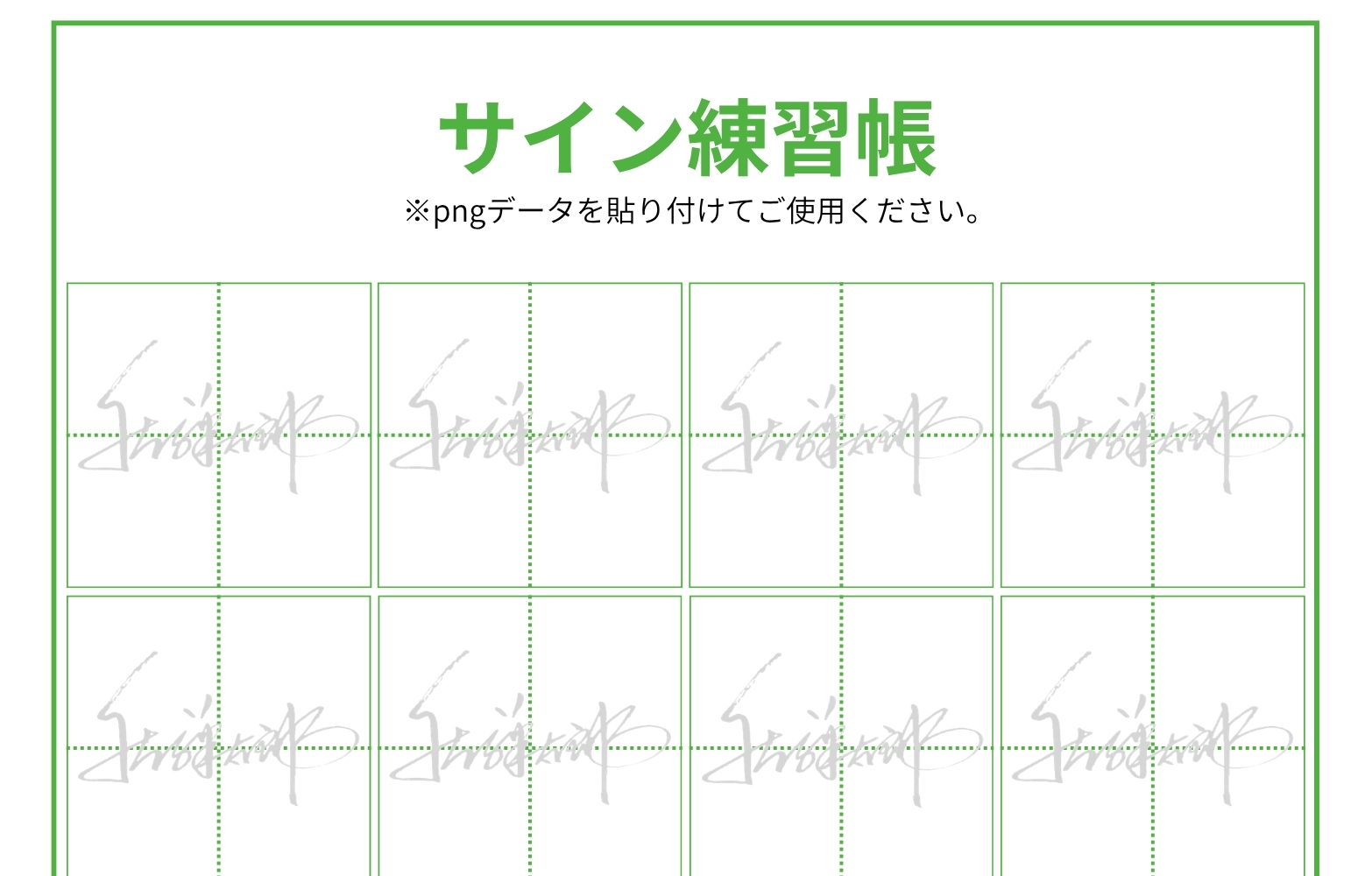 ご購入頂いたサインのPNGデータを貼り付けていただき、プリントして練習帳としてご使用ください。