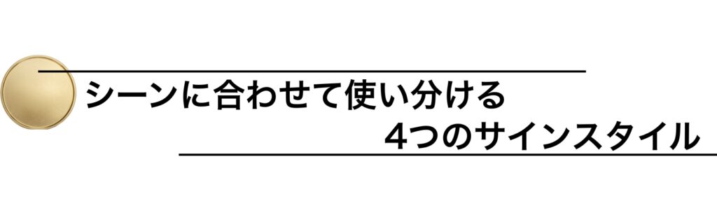 契約書にはフォーマルなサインを、メッセージカードにはカジュアルなサインを添え、ホテルのサインには一筆でさらりと。シーンに合わせて使い分けることで、あらゆる場面で自然に映える一筆をお届けします。